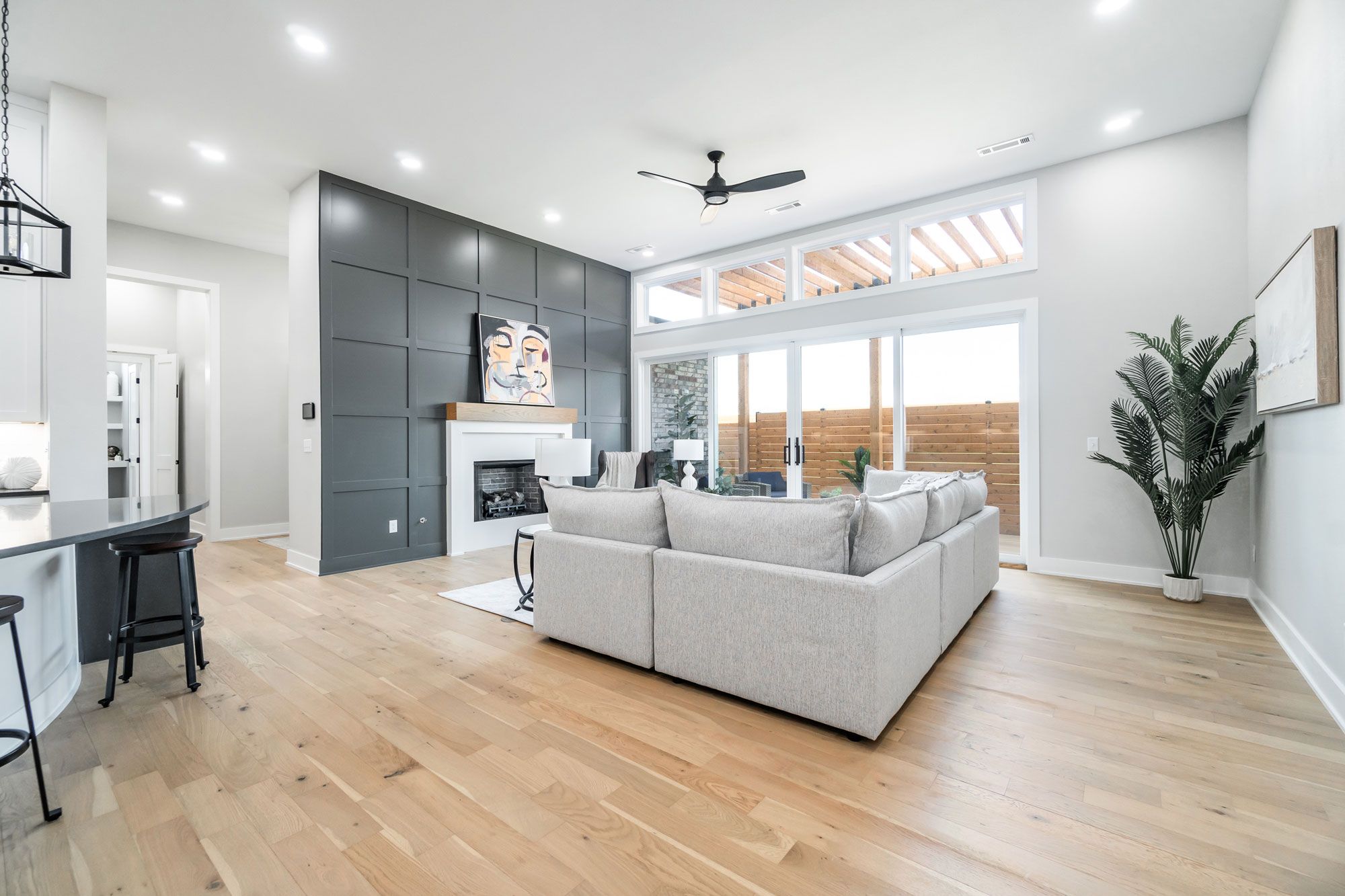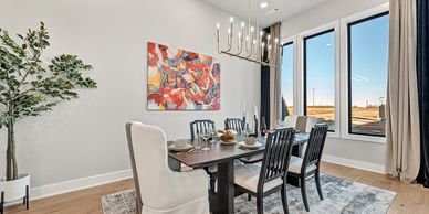 Natural engineered wood floors throughout the dining, kitchen, great room, and grand entry.