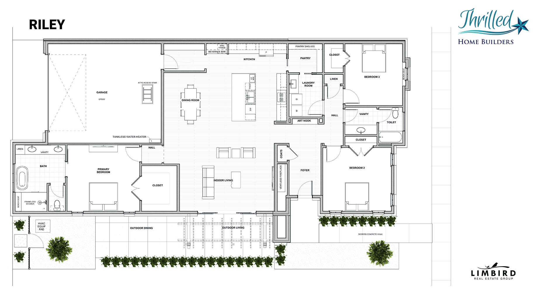 Discover "The Riley," a remarkable garden home in Harmony within the Aurora Community, featuring 3 bedrooms and 2 baths with a seamless flow and a thoughtful layout spanning over 2250 square feet. The spacious living area, dining room, and gourmet kitchen are connected by an open-concept floor plan, ideal for both family living and entertaining. Generous windows let in plenty of natural light, showcasing high-quality finishes such as premium solid surface countertops, custom cabinetry, and GE Cafe appliances including a gas cooktop with six burners. The kitchen also boasts a waterfall island, a microwave drawer, and a stainless steel hood. Additional premium features include soft-close cabinets with under-cabinet lighting, an undermount granite kitchen sink, a wine and coffee bar (in select plans), a walk-in pantry, floor-to-ceiling cabinets, and pullout utensil and spice drawers. The luxurious primary bath features premium solid surface countertops with under-mount his/hers sinks, a makeup vanity, a separate tub/shower with a glass enclosure, and floor-to-ceiling tile, along with a primary closet offering display shelves or traditional storage options. Secondary bathrooms feature tiled tub/shower combos or tiled showers only, with premium solid surface counters and under-mount sinks. Enjoy modern conveniences like a tankless water heater, an Ecobee thermostat, keyless entry, and completely private patios with wood-look tile, astroturf, and gas hookups for grilling. The "Lock & Leave" community with private gate entry ensures peace of mind with zero-maintenance yards. Harmony's maintenance-free lifestyle includes internet access, lawn care, and courtyard maintenance. The community boasts amazing amenities such as two pools, a playground, a clubhouse, a dog park, a bike repair station, and a basketball/pickleball court. With updated design packages ensuring no two homes are exactly the same, "The Riley" offers the perfect blend of comfort and convenience in a lively, close-knit neighborhood within the vibrant Aurora Community.